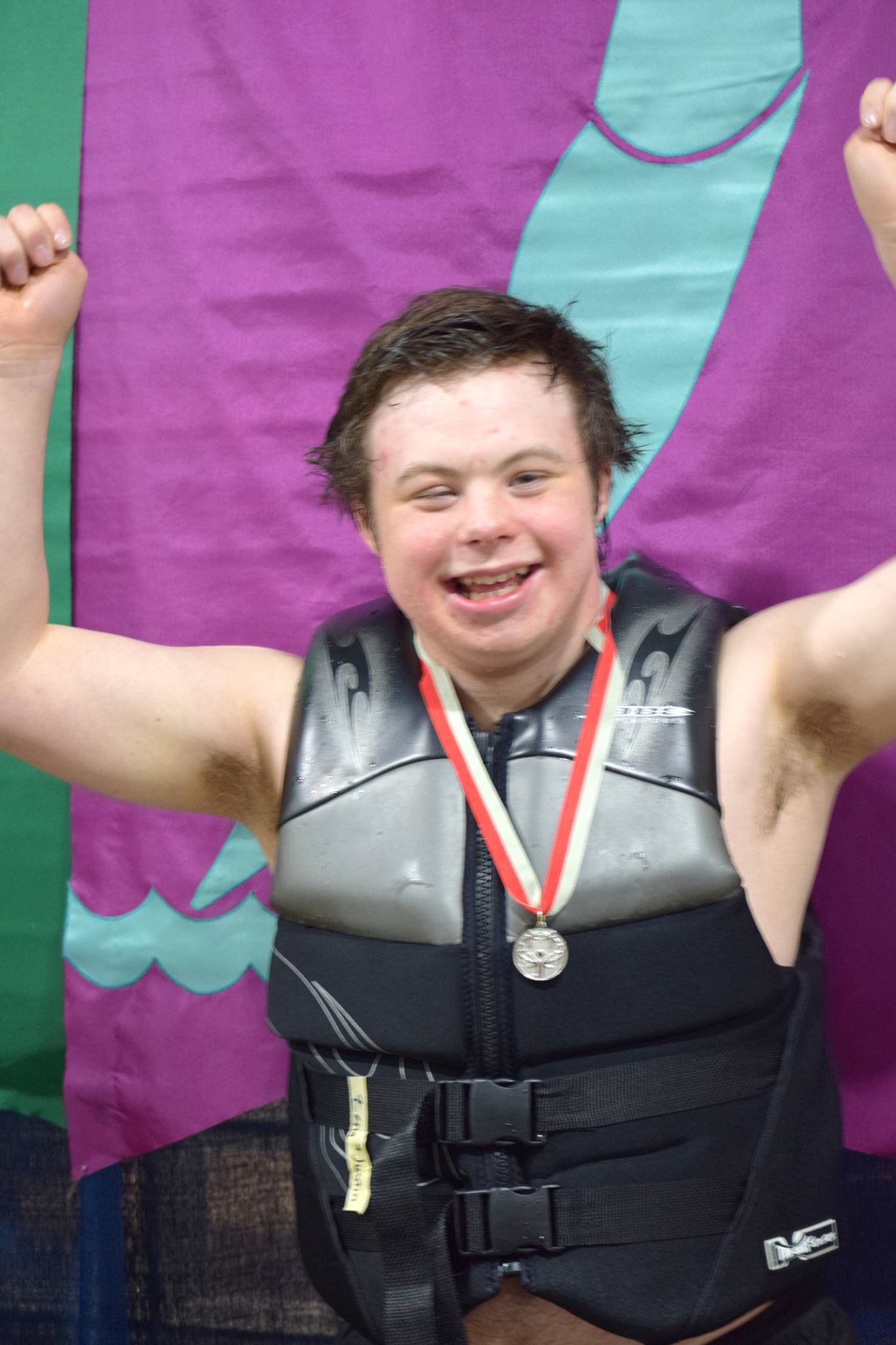 Tucker would be competing in the same 3 events he had competed at in regional competition, but this time competition was in the Olympic sized pool instead of a regular high school swimming pool. My concern was that he does not understand the depth of the pool and this year he would be swimming without the flotation device. Tucker didn’t win a medal in his 25 m swim in the big Olympic sized pool, in fact, he technically would have been disqualified for this event. We aren’t really sure of why he stopped during his 25 m swim, the start was rushed–maybe his goggles weren’t right? Who knows? But one thing we do know, he figured out he could not touch the bottom of this pool as he can in the pool they usually practice in. He stopped and his head bobbed under at one point and this over protective, deeply invested Mamma’s heart sank and we were sure if he was going to make it across without assistance. He swam over to the lane divider and grabbed it for a moment, rubbed his nose and then continued on. The coach signaled one of the other coaches to be ready and the lifeguard watched ready to jump in and I hear a voice in my head saying: “come on Tucker, just keep swimming!” and I cheered and yelled and waved my arms like an insane, overexcited crazy woman as he swam and safely made it to the finish line of the edge of the pool all by himself. This is one of those times where that Special Olympics motto rings SO true and warms a momma’s heart: He WAS Brave!